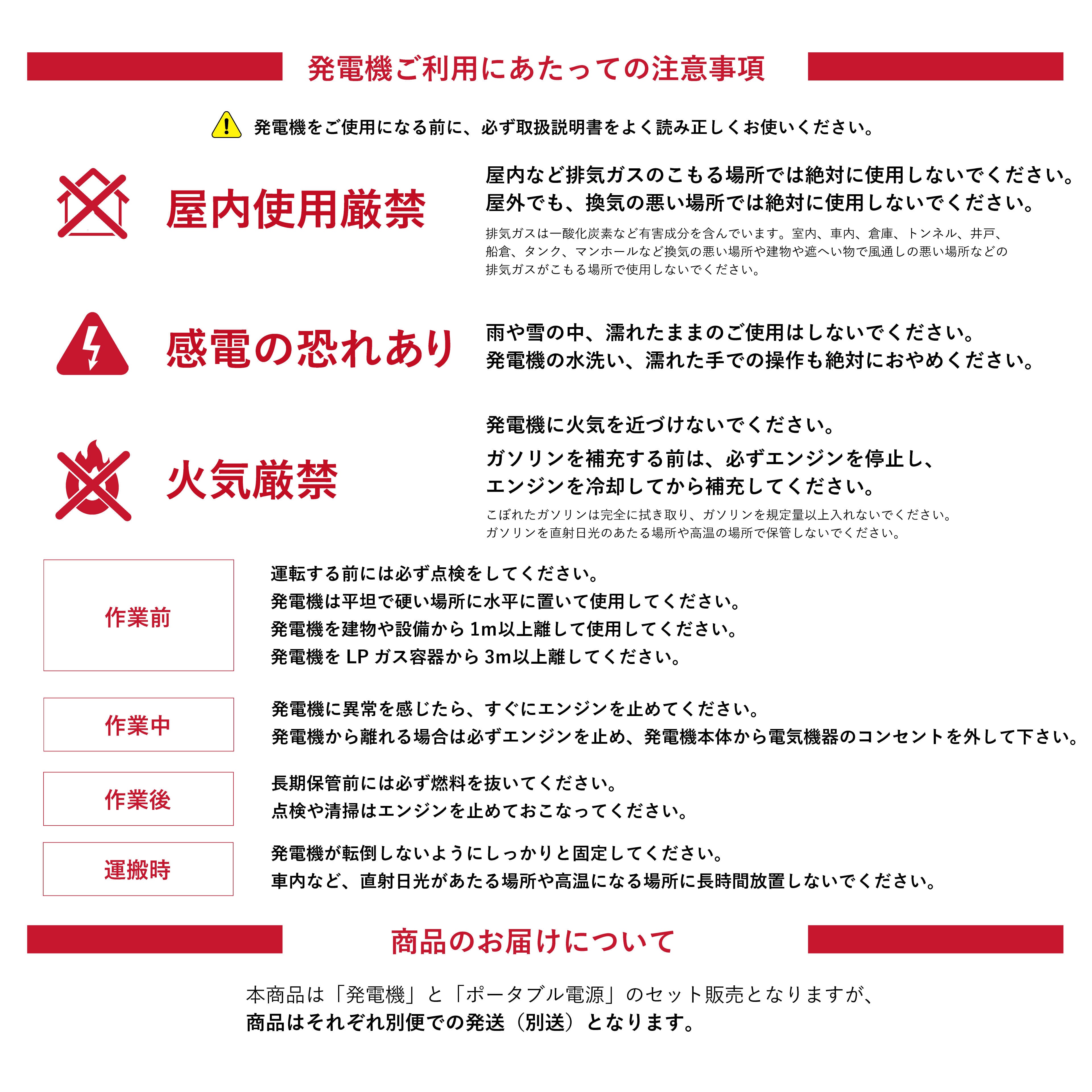 ※本商品は「発電機」と「ポータブル電源」のセット販売となりますが、商品はそれぞれ別便での発送(別送)となります。